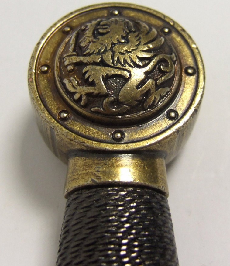 Dísztőr antikolt pengével, fémötvözet szerelékkel, hüvellyel.
