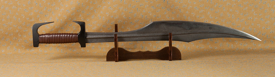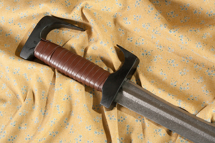 A film alapján készített másolat, antikolt szénacél pengével. A kardmarkolat bőrrel bevont, a kard súlya 1900 gramm.