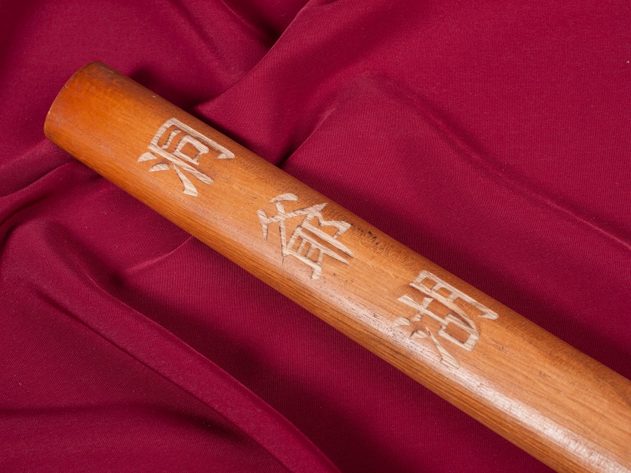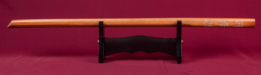 Fából készült gyakorlókard, a markolaton faragott japán írásjelekkel. Súlya: 600 gramm.
