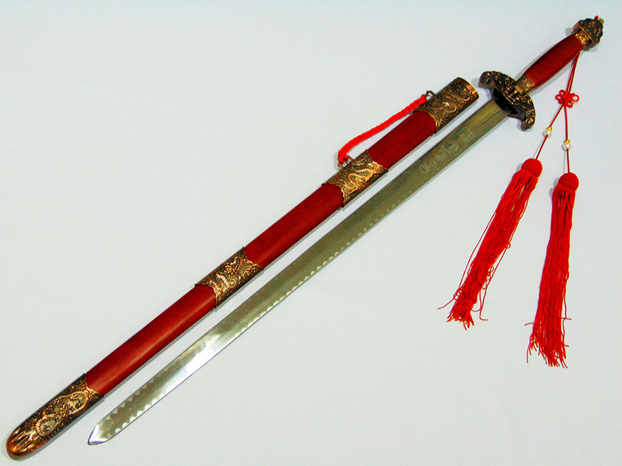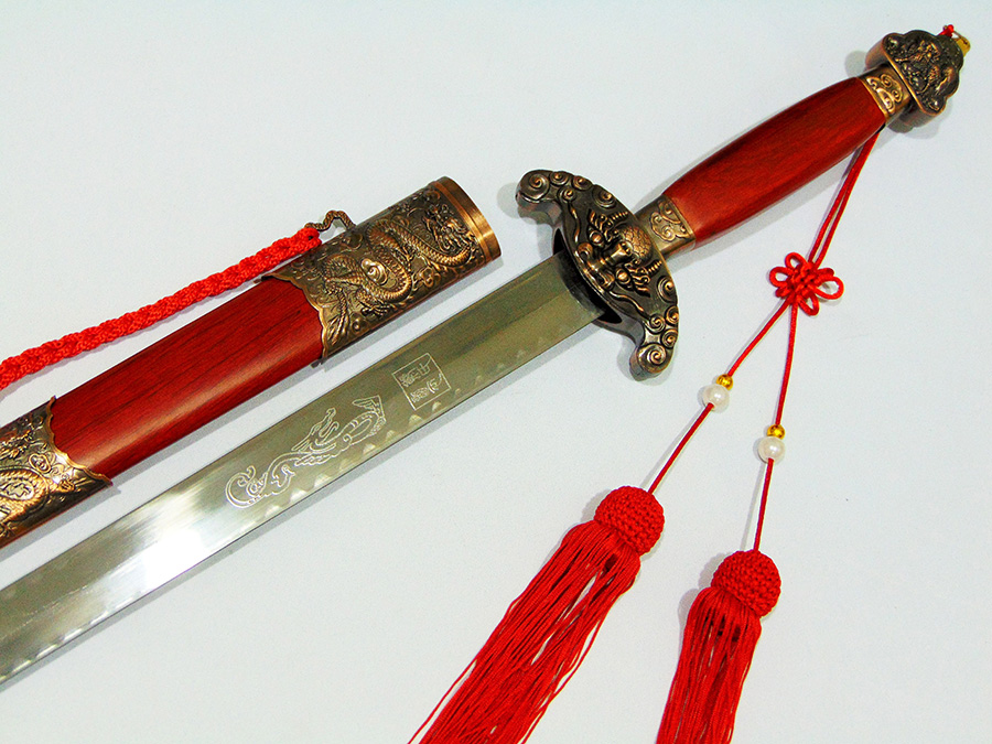 1045-ös acélból készült egyenes kard, famarkolattal és kardhüvellyel. A fémötvözet-szerelékek sárkánymotívumokkal díszítettek.