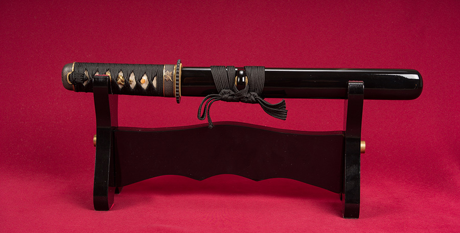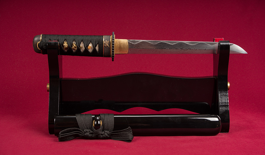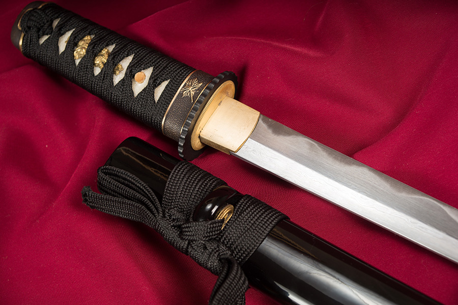 Acélpengével készített díszkard. A tsuba anyaga cink-alumínium öntvény, a kardhüvely lakkozott keményfából készül.