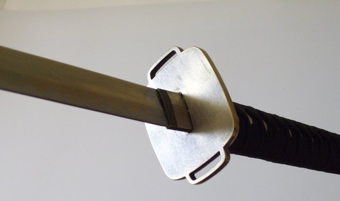Acélpengével készített díszkard, fa hüvellyel, fémötvözetből készült tsubával.