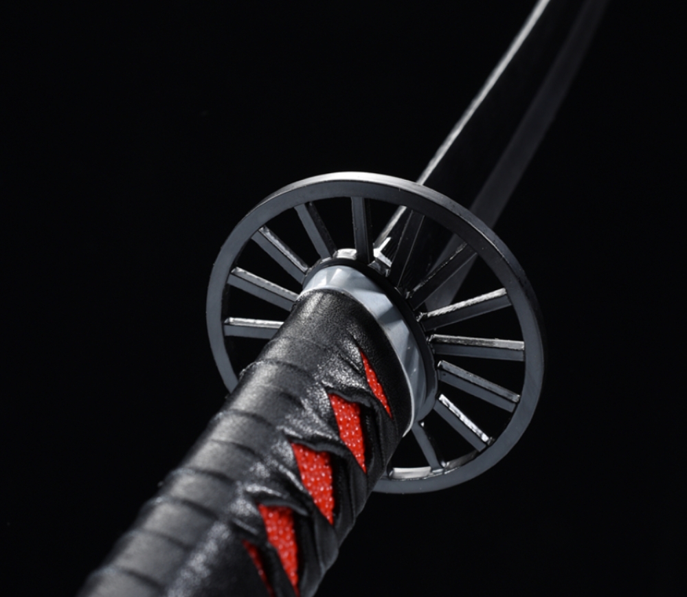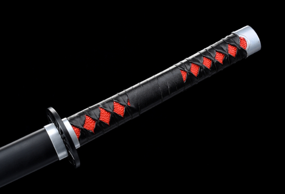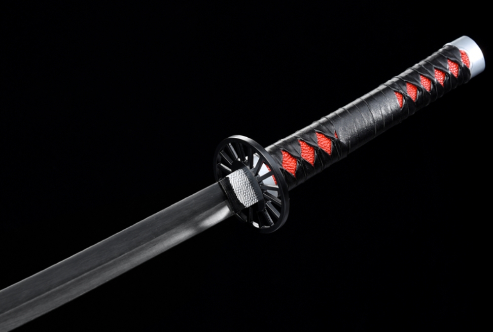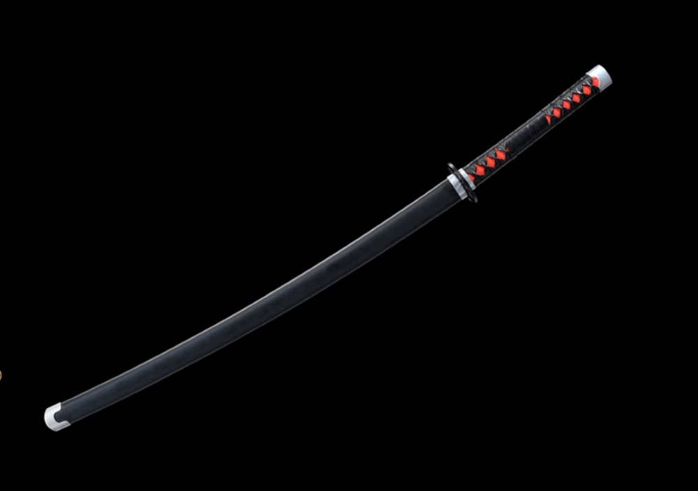 Feketített pengével készített díszkard, fa hüvellyel, fémötvözetből készült tsubával a Demon Slayer sorozatból.