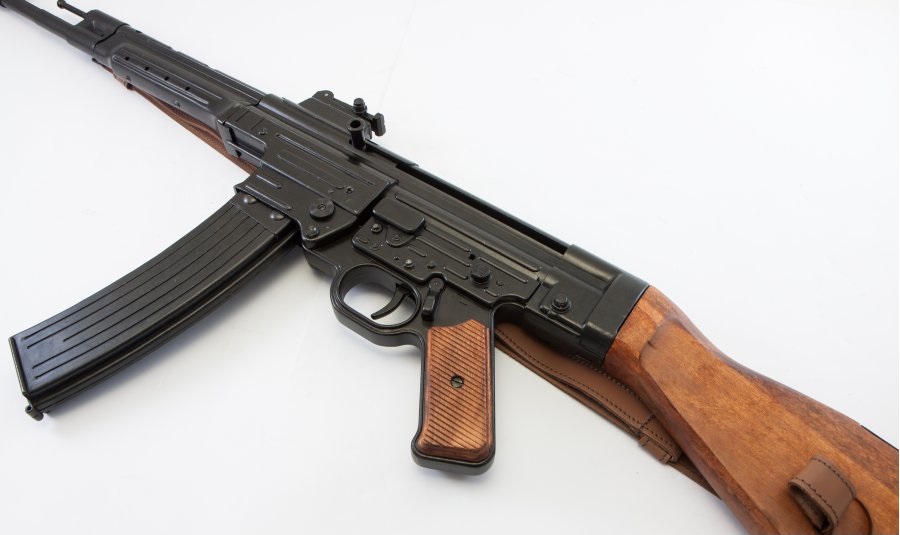 Díszfegyver vállszíjjal, működő mechanikával, a tár kivehető. Anyaga fa és fém, súlya 4824 gramm.