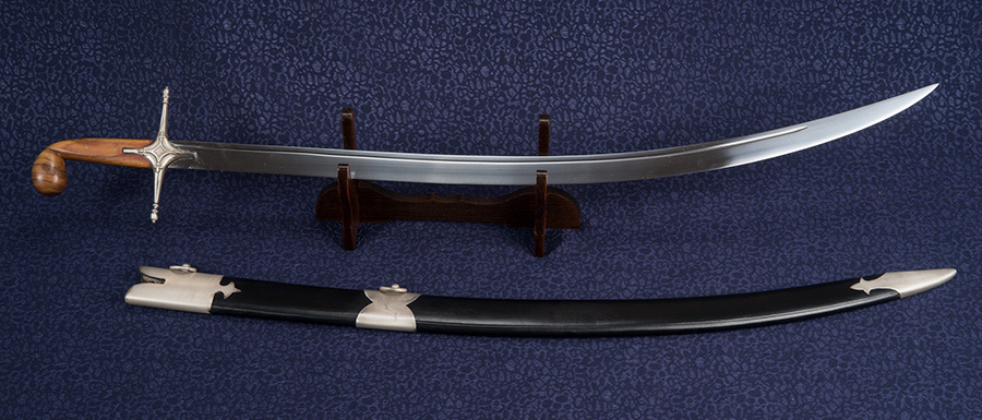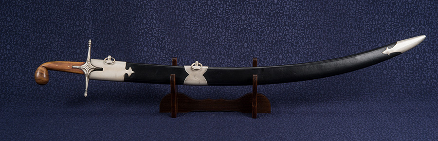 Az arab és közép-ázsiai vidéken elterjedt, ívelt, egyélű mameluk kard a shamshir, más néven: scimitar, talwar, shotel… A vércsatornával könnyített kard magas széntartalmú acélból készül. Markolata faragott keményfa, fa hüvelye bőrrel borított, acél szerelékekkel ellátott. Súlya hüvely nélkül 718 gramm. A szablyát gyűjtők figyelmébe ajánljuk.